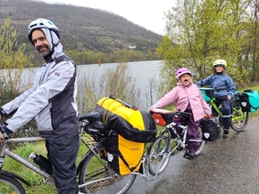 Requinqués, nous profitons de cette étape pour changer les vélos. Estelle galère avec le follow-me (système qui permet de mettre Lucie en tandem sur le vélo d’un adulte) alors qu’elle n’avait pas rencontré de problèmes les dernières fois que nous étions partis. Mais depuis, Lucie a grandi, elle a changé de vélo et on a plein de sacoches en plus. Le follow-me ira sur mon vélo et Estelle tractera la remorque pleine de matériel.