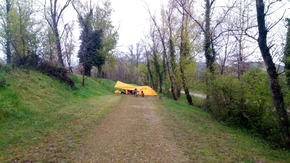 Pas encore biens rodés pour le bivouac sous la pluie, nous sommes bien humides, le test de fusionner le tarp avec la tente n’est pas très convainquant et nous permet de nous réveiller avec beaucoup trop d’eau dans nos affaires.