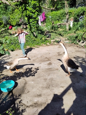 Nathalie aime beaucoup les animaux et en plus de ses deux oies, son chien et son chat, elle nous présente Pioupiou, son coq qu’elle a recueilli lorsqu’il était un tout petit poussin et qu’elle a nourri.