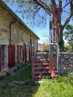 Florence, l’épouse d’Yves, nous fait faire le tour de son jardin pour choisir la meilleure place où planter la tente et nous ouvre la porte de son atelier. Ses œuvres sont très belles, peintures, sculptures, peuplent le jardin et la maison.