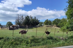 Nous nous sentons en insécurité. Et lorsque nous décidons de rejoindre le petit village à quelques centaines de mètres pour manger, nous devons le faire à pieds pour éviter de nous retrouver au milieu de la départementale avec le vent de travers. Le moral n’est pas totalement au beau fixe. Cela ne nous empêche cependant pas de saluer les autruches de la ferme qui borde la route !