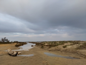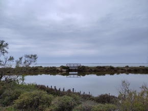 Mais quelque chose m’y attire et je renâcle à passer par la route (qui double la distance à parcourir). Je veux en avoir le cœur net et vais m’y promener le soir. C’est magnifique cette digue entre marais, canaux, étangs et mer. J’y croise plusieurs cyclistes et les interroge sur l’état de la piste. Nous avons été échaudés par la piste Méjane - les Saintes. À chaque fois, les cyclistes m’indiquent que la piste est bonne malgré quelques passages courts. J’insiste un peu car nous sommes très chargés mais les discussions me rassurent.