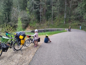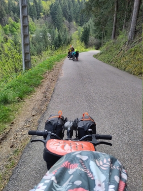 On part donc pour 5,5 kms de montée à 12% puis une quinzaine de kms entre faux plats et montée à 5 %… Autant de dénivelé si chargés, c’est une première. Étonnement on se dit que l’on pourra y arriver et la motivation d’atteindre Vallon nous porte tous les 4.