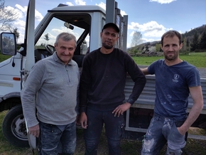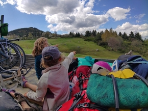 Soudain, alors que nous reprenons la route, une camionnette s’arrête et nous propose de nous monter avec tout le matériel dans la remorque en haut de cette côte ! Accueilli dans la joie et la gratitude pour chacun ! Nous voilà embarqués.
