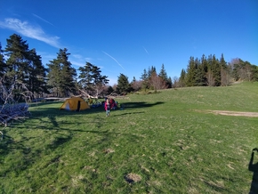 Arrivés sur le plateau, nous reprenons la route mais nos corps sont bien épuisés des efforts fournis avant et luttent quelque peu pour avancer dans les côtes. Arrivés au premier lieu qui nous semble le plus propice pour nous arrêter, nous cherchons également de l’eau car toutes nos réserves sont épuisées.