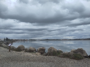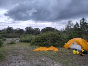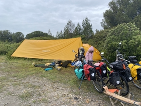 Les enfants se seraient bien arrêtés plus tôt, mais où ? Arrivés à Fos sur Mer nous cherchons un petit endroit où poser la tente. Nous tombons sur un parc arborés et parsemé de crottes de chiens. Un riverain nous indique le bord de l’étang de l’Estomac comme endroit plus tranquille. C’est donc là que nous nous installerons pour la nuit. Il n’est pas loin de 16h.