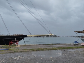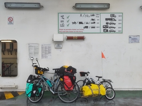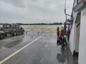 Le camping où nous avons pu trouver un peu de sec et de chaud est à quelques centaines de mètres du bac qui nous permet de traverser le bras du Rhône. Gratuit pour les piétons et les cyclistes. Ça c’est bien, ça fait plaisir ! Le plaisir est de courte durée car l’équipe du bac connaît son travail. Lucie est déçue, elle pensait que nous allions prendre le bateau bien plus longtemps.