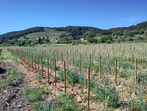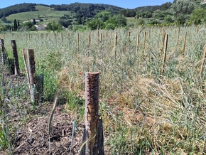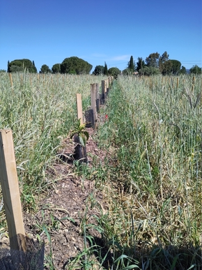 Nico nous a emmené sur une parcelle qu’ils viennent d’acquérir et de planter. Ils y ont également planté des haies et des rangs d’arbres fruitiers. Le but : profiter de l’effet climatiseur des arbres. Ils ont également semé des engrais verts entre les rangs comme font beaucoup de vignerons maintenant.