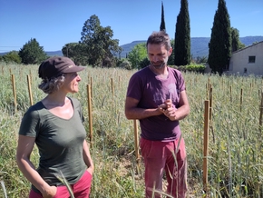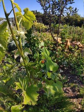Sur une autre parcelle, proche de l’habitation de Marc, la vigne a été plantée il y a bien longtemps, mais il y a très peu de terre car la roche est peu profonde. Aussi, la vigne peine-t-elle à s’épanouir. Plutôt que d’arracher la vigne pour une autre culture, ils ont décidé de cultiver entre les rangs d’autres espèces en suivant le principe de la permaculture. Chaque espèce peut aider l’autre en lui apportant ce dont elle a besoin et sans la gêner. Herbes aromatiques, légumineuses, médicinales sont donc implantées et peuvent permettre des récoltes qui apportent un revenu complémentaire à la vigne qui semble se plaire à ces associations.