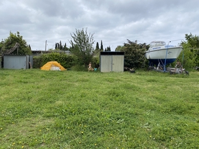 Si nous allons là, c’est que Xavier et Débo, nos voisins du beaujolais, ont acheté un terrain à proximité et que nous pouvons y poser notre tente ! Nous arrivons vers 14h, les enfants veulent absolument se baigner. Allez !