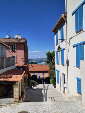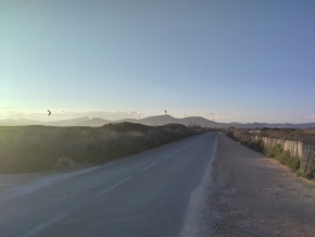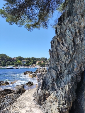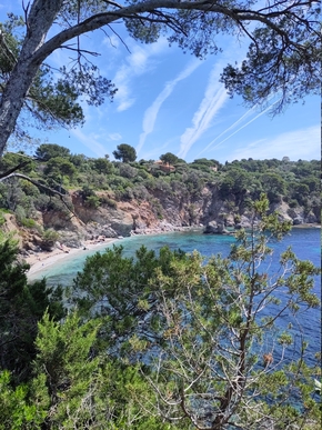 La sortie de Toulon n’est clairement pas optimisée pour les vélos ! Mais nous nous frayons tout de même un chemin entre voitures, scooters et bus qui nous amène à la voie douce. Nous suivrons cette voie jusqu’à la célèbre plage de l’Almanarre. On nous l’a ventée cette plage : “La plus longue d’Europe”, “le spot idéal pour le kitesurf”, “trop beauuuuuu”.