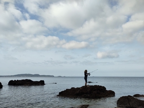 Le lendemain, c’est lundi. Claire et Jean-Christophe arrivent mardi. Léon a très envie de pêcher et je pars avec lui à la fraîche pour tenter de rapporter le repas de midi. Le matériel que nous avons n’est pas du tout adapté à une pêche de bord, je ne me fais donc pas trop de soucis pour les poissons ou sur la recette à appliquer pour les cuire. Nous arpentons la côte à la recherche d’un endroit propice, jetons quelques fois notre ligne et avançons ainsi jusqu’à rencontrer Laurent et Mathis à qui nous demandons un cours.