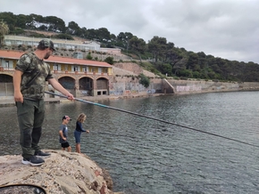 Laurent, natif d’ici, est passionné de pêche depuis l’enfance et la pratique sous de nombreuses formes. Il a bossé dans le domaine pendant plusieurs années et est un peu mieux équipé que nous. Il répond volontiers à nos questions et nous passons un bon moment autour de ses cannes. Il a posé des cannes de fond pour des poissons sérieux et en attendant que ça morde (ou pas), lui et son fils pêchent des poissons de bordure qui sont relâchés. C’est la période de reproduction et il est très sensible à la préservation des espèces.