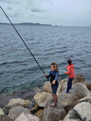 Il est l’heure de partir, allez, on y va…. et hop, Léon réussit au dernier moment à pêcher son premier poisson ! Un beau cadeau de la mer, de Laurent et de Mathis.