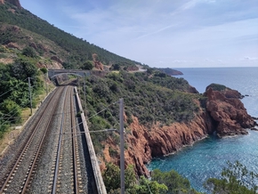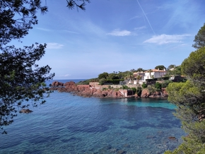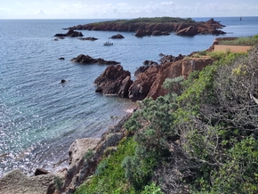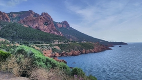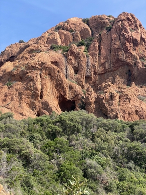 C’est parti pour suivre la route de la corniche et passer ainsi le cap Esterel. Nous sommes subjugués par la beauté de cette route qui est très vallonnée mais qui nous émerveille à chaque virage. C’est très minéral, cette roche rouge est partout et tranche avec le bleu de la mer.