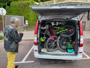 …ou pas. Car s’arrête devant nos vélos un petit groupe avec qui nous entamons la discussion. Enthousiasmé par notre aventure, Nicolas nous propose de venir passer la nuit chez lui. Mais il habite au-dessus de Grasse et ça grimpe. Mais il a un mini-bus et peut tous nous emmener. Mais ça risque de ne pas rentrer. Mais ses amis nous disent que ça vaut vraiment le coup d’aller chez lui. On hésite (en fait on n’hésite pas trop, on a plutôt tendance a se laisser porter par les rencontres), et on dit banco. ET ÇA RENTRE.