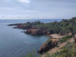 En revanche dès notre arrivée dans une partie plus urbanisée, la côte nous coupe les jambes. Pour ma part je suis obligée de m’arrêter à plusieurs reprises, avec des difficultés a reprendre mon souffle. L’énergie elle aussi a changé brutalement et nous le ressentons tous. La descente finale nous mène à Theoule-sur-Mer où nous nous posons pour pique-niquer sur le sable au bord de la mer et se baigner. Ce soir nous irons au camping…