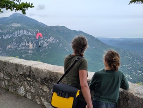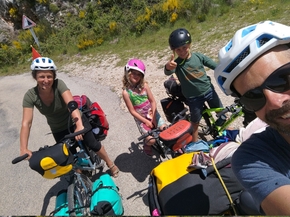 L’arrivée sur le village de Gourdon est réellement magnifique. Nous visitons Gourdon et y mangeons une salade maison que les enfants ne sont pas spécialement heureux de retrouver. Le village offre une vue sur la vallée à couper le souffle. Au moment de repartir, nous nous rendons compte que la crevaison n’est pas bien réparée, il faut recommencer. Ce qui nous permet de rencontrer Alessio, un italien qui nous indique quelques coins à visiter chez lui. Estelle et les enfants discutent avec les commerçants et le marchand de sucettes finit par offrir deux énormes sucettes aux enfants !