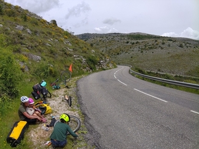 Nous trouvons une petite place pour réparer. C’est ballot, nous avons changé les pneus des vélos adultes à la Ciotat pour mettre des pneus increvables Schwalbe Marathon Plus. Mais le soucis ne vient pas du pneu; c’est la jante. La bande plastique qui protège la chambre à air est un peu abîmée et il va falloir la changer. En attendant on répare sur le bord de la route. En reprenant le chemin, je n’arrive pas a passer au-dessus de l’émotion qui se libère petit à petit et fait naître au fur et à mesure un sentiment d’insécurité sur mon vélo. Sur le coup, mon esprit est resté “froid” pour gérer au mieux la situation, pas d’émotion dans l’instant car tout mon système est alors orienté dans la recherche de la meilleure solution a apporter.