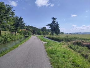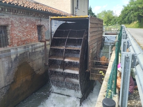 La campagne est simple et charmante, ponctuée d’oratoires et de chapelles. Les affiches des messes en mémoire des morts nous offrent les visages des disparus dont on fête l’anniversaire de décès. L’eau continue de nous accompagner tout au long de notre route en pente douce. Nous croisons une belle roue à aubes en fonctionnement et essayons de comprendre comment ça marche et à quoi ça peut servir.