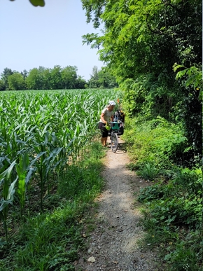 En fin de matinée, ça y’est, nous savons maintenant où et quand mes parents vont nous rejoindre. Ils ont décidé de venir nous voir quelques jours tant que nous sommes en Italie et après bien des ajustements, nous avons fixé un lieu et une date. Ce sera au sud de Trento le 2 juillet. Ce qui nous laisse beaucoup de jours pour faire peu de kilomètres. Nous décidons donc de changer de programme et de faire un bon détour.