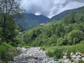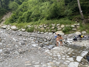 Nous avançons. Le paysage de montagne qui s’offre à nous nous ravit. Le soleil a beau être éclipsé par quelques nuages, il tape. Nous faisons une bonne pause le long d’un gros torrent agité. Les enfants jouent tranquillement, et là, c’est le drame. Enfin, Léon se reçoit un caillou sur l’épaule et ça lui fait très mal. Incapable de continuer.
