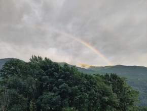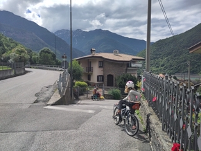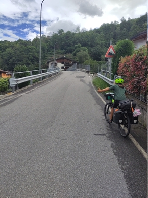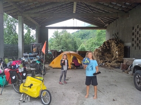 Elle est très belle cette piste cyclable. Mais elle est très vallonnée. Nous n’allons vraiment pas loin. Nous nous arrêtons dans un tout petit village à flanc de montagne. Il doit bien y avoir un endroit plat pour nous, ici ! Nous croisons Ana-Maria qui s’émerveille devant nos enfants et qui parcourra tout le village pour trouver le bon spot pour nous en demandant à tous ses habitants.
