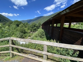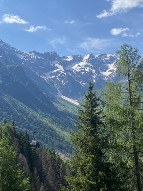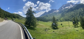 Nous devons arriver à Ponte di Legno aujourd’hui. Cela ne devrait pas être difficile car il y a peu de kms. Mais cela monte tellement ! Nous sommes sur une piste magnifique, vivante, entre la rivière et les arbres, les chemins ne sont pas rectilignes ce qui rend le parcours très agréable.