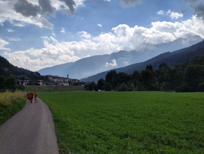 La descente d’hier ressemblait à une chute. Celle d’aujourd’hui est une balade merveilleuse. Elle nous permet de déguster les brumes de la rivière comme de la barbe à papa. Les fermes et les alpages nous régalent de leur collines douces, la descente est un plaisir. La technique dite du “panino italiano” semble fonctionner et la remorque tient le coup. Merci Marco !