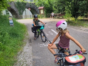 Nous avons fourni beaucoup d’efforts ces derniers jours. Et la petite côte qui s’annonce après la pause méridienne est celle de trop pour Léon. Plus de jus. Rien. Zéro. Mais nous ne pouvons trouver de place pour mettre la tente ici. Alors il faut continuer. Nous remettons en place la technique dite du “convoi exceptionnel” et avec une chambre à air et une sangle, j’attache Léon derrière Lucie qui est attachée à mon vélo. La petite côte s’avère plus sportive que prévu !