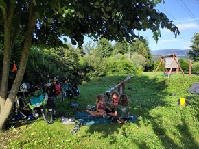Nous finissons par atterrir un peu par hasard dans un super parc communal pour poser la tente. Il est dédié à la Déclaration Universelle des Droits de l’Homme. Cela nous permet d’en parler aux enfants, tout est prétexte à apprendre ! Le parc est vaste, avec des jeux originaux, il y a des haies variées, une mare, une fontaine, des tables, des habitants sympa autour…