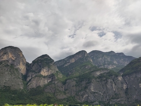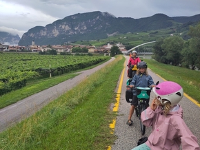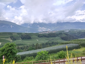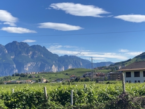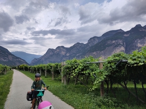 Vers midi, nous arrivons à un point de jonction des rivières. Notre vallée rejoint celle de l’Adige. Le paysage est saisissant. Nous arrivons dans la culture de la vigne. Elle n’est pas comme chez nous dans le beaujolais cette vigne, elle est palissée en hauteur comme des auvents, ce qui permet de ramasser les grapes à l’abris du soleil.