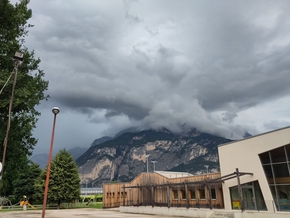 Les gros nuages noirs qui s’éparpillent autour de nous nous incitent à se mettre à l’abris pour manger. Nous décidons même de nous réfugier dans un café pour échapper (de justesse) à l’énorme orage qui déferle sur le village où nous nous trouvons. Nous patientons, bien contents de ne pas être sous ces trombes d’eau.