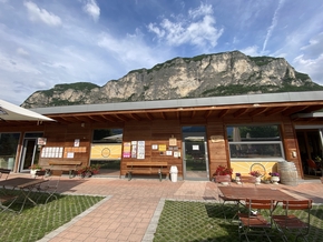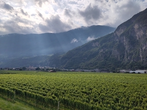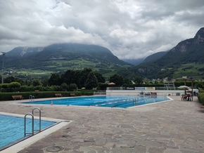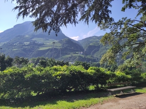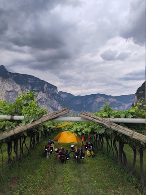 Nous montons maintenant vers Bolzano. Et nous arrivons dans un bar labellisé FIAB, où des douches et toilettes gratuites sont à disposition des cyclistes de passage. Les tonnelles de vignes vont nous accueillir pour la nuit… Mais nous avions oublié que le temps était à la pluie et nous sommes réveillés vers 3h par les traitements des pommiers qui longent les parcelles.