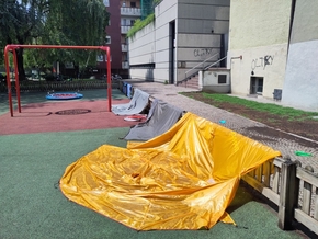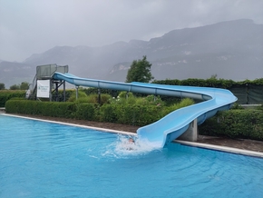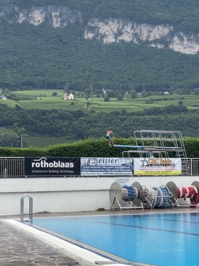 Nous reprenons la route joyeusement le lendemain, un peu sous la pluie et soudain, le long de la piste cyclable que nous empruntons depuis un moment, un grand complexe calme avec plusieurs bassins et des plongeoirs apparaît. Les enfants ont tellement envie de se baigner et le lieu nous inspire tellement tous les 4 que nous nous arrêtons pour en profiter, un peu sous la pluie, mais dans la joie !