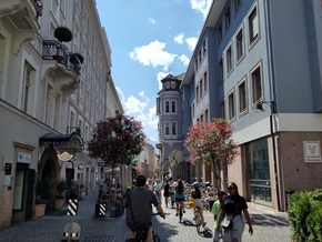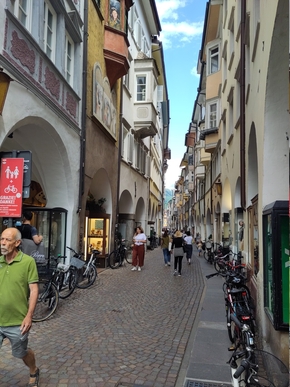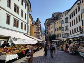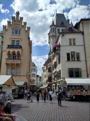 La commande de la nouvelle remorque passée et la livraison enregistrée en poste restante, nous découvrons la ville et la Piazza delle Erbe. La culture autrichienne est de plus en plus présente, nous pouvons désormais observer la double langue écrite un peu partout et sur les marchés, les bretzels et strudel côtoient les brioches italiennes.