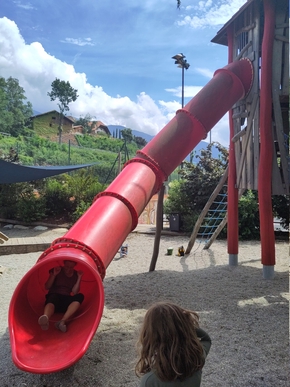 Sur le chemin nous choisissons de faire des pauses dès qu’un endroit nous attire pour nourrir nos sentiments de tranquillité et de joie. Alors lorsque nous voyons ce petit bar en bord de piste avec ce magnifique toboggan, bordé par une rivière dans laquelle nous pouvons mettre nos pieds, nous nous arrêtons. Je veux tester le toboggan avec les enfants mais moi qui ai le vertige, je m’aperçois que cela est compliqué d’oser me lancer ! Lucie m’aide en me faisant plein de démonstrations, voir comment ça fait si on se met plus penché à droite ou à gauche, si on essaye de freiner avec ses pieds. J’aime ce moment partagé avec elle où les rôles s’inversent et où elle prend tant à cœur de m’accompagner. Et je me lance. Que c’est drôle un grand toboggan !