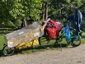 Le lendemain, la route reprend sous le soleil. Dans les magasins la radio est maintenant en allemand. À midi, nous nous arrêtons tôt dans un petit parc. Je me pause un instant car je me suis réveillée avec le sentiment que nous manquions de nutriments… Et en effet nous sommes bien carencés, notamment en magnesium. La chaleur moite et étouffante que nous vivons dès qu’il ne pleut pas nous fait transpirer énormément et comme nous sommes tout le temps dans l’effort, nos corps perdent beaucoup trop de minéraux par rapport à ce qu’ils absorbent. Les fruits et légumes sont assez rarement bio et de toute façon pauvres en ressources. Avant de partir j’avais mis dans mes bagages un sachet de Nigari que j’ouvre pour nous confectionner une eau magnésienne qui va venir nous remettre à niveau. J’avais un sachet d’algues nori de côté que j’ouvre également et je relance mes graines à germer, petites bombes nutritionnelles, dont les enfants ne raffolent pas mais là, il faut que nous prenions soin de nous et de notre bel outil. Nous décidons donc de faire de petites étapes, de prendre tout notre temps et de se remettre tranquillement…