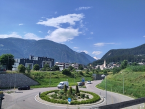C’est reparti ! Et… ça monte ! Mais moins. Et après la montée vient une descente assez jolie jusqu’au lac. Arrivés tout proche je ralentis lorsque tout à coup mon vélo part dans tous les sens. “Léon il y a quelque chose qui ne va pas !”. Crevé. Roue arrière à plat. Je décide de faire le dernier km en poussant car nous devons monter pour rejoindre la route qui borde le lac. Le fait de savoir que nous n’irons pas beaucoup plus loin est rassurant en soi et me donne l’énergie de pousser le vélo crevé.