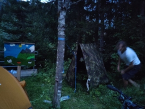 Je suis persuadé que les règles sont super cool en Autriche et qu’on va pouvoir bivouaquer sans problème. Mais c’est marrant, ce n’est pas du tout ce qui est marqué sur le site du Land. Eh oui, l’Autriche c’est une chose, mais chaque région (Länder) peut avoir une réglementation différente. Et il est bien indiqué que le bivouac est interdit dans le Tyrol. Nous demandons un peu par-ci par-là et finissons par comprendre que c’est interdit mais largement toléré dans les conditions dans lesquelles nous le pratiquons… ouf ! Nous monterons ainsi notre tente au bord d’un petit lac et Victorio, son hamac. Bonne nuit.