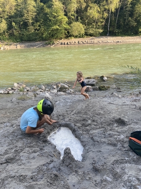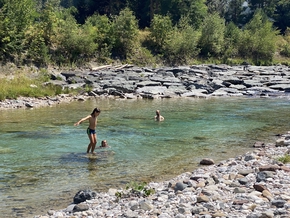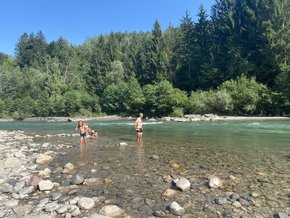 La chaleur et le monde nous fait vite enfourcher de nouveau nos vélos pour trouver un lieu où nous poser. Nous débouchons comme par merveille sur une rivière, la Gail, dans laquelle nous pouvons nous baigner, nager et nous laisser porter avec précaution par le courant. Cela plait beaucoup aux enfants !