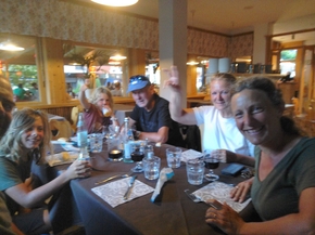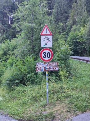 Ingrid et Hans nous rejoignent. Ils viennent nous chercher en voiture pour nous inviter au restaurant à Tarvisio ! On a grand plaisir à les retrouver et nous laissons nos vélos et la tente en toute confiance à l’endroit du bivouac.