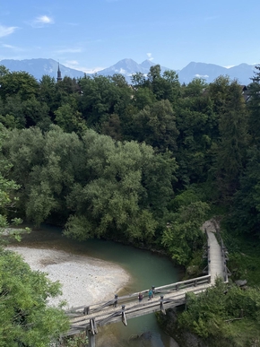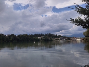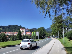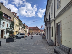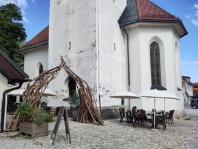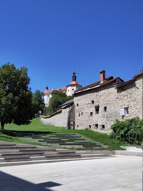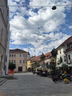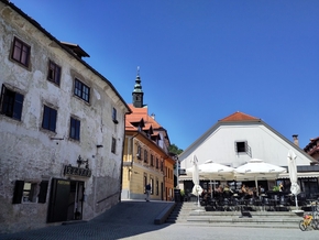 Il ne nous faut pas longtemps pour arriver à Kranj et nous profitons de cette jolie ville. Nous posons nos vélos et y déambulons tranquillement. La pause de midi se fera forcément en bord de rivière qui se situe 40 mètres plus bas et qui offre une charmante promenade (et des baignades, bien sûr).