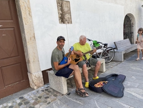 En remontant à nos vélos, un homme chante accompagné de sa guitare un blues slave et offre des bonbons aux enfants. Je sors le ukulele et l’accompagne. Nous passons un bon moment et les habitants habitués s’arrêtent et discutent un peu. La musique est une langue universelle.