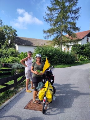 En repartant, nous longeons à nouveau ce beau jardin qui nous avait fait de l’œil hier. Ce matin, Mika s’en occupe et après une sympathique discussion, nous repartirons avec de beaux poivrons bien bio.