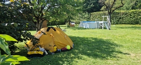 À peine me présenté-je à Lojze qu’il me propose de rentrer pour boire un café ou une bière. Je lui explique notre situation et lui demande s’il est possible de planter la tente dans le pré, il me montre son jardin. Nous dormirons là. Mais il doit absolument me laisser car Janja Garnbret, la grimpeuse slovène est sur le point de concourir pour la médaille d’or. Il y a des priorités quand même. Les enfants sont déjà dans la piscine et pendant que je déplace les affaires, j’entends les cris de joie annonçant que nous allons passer une bonne fin de journée. Estelle qui était au téléphone arrive enfin et découvre que nous avons trouvé un endroit parfait pour nous pour les deux nuits à venir.