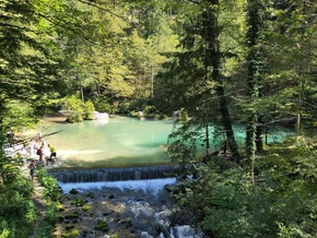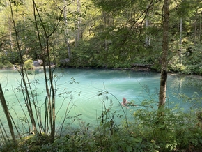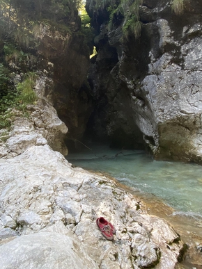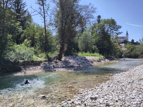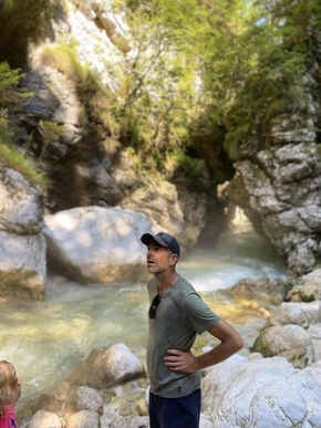 Le lendemain, nous roulons allégés vers la source de la jolie rivière qui passe au pied de la maison. Il y a pas mal de monde, la source est très fraîche et des slovènes, essentiellement de jeunes hommes musclés, viennent s’y immerger et rester plusieurs minutes. J’y vais sans trop de problème, mais ne reste pas du tout. Le froid mord mes pieds. Les enfants iront aussi.