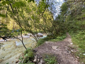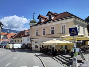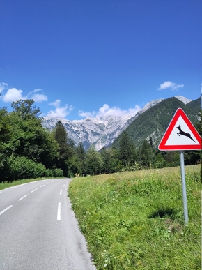 Nous avançons tranquillement vers Kamnik qui n’est pas très loin. La jolie petite ville est paisible et nous y marchons avec plaisir. Il fait très chaud. Nous préférons partir pour manger en bord de rivière. Seulement quelques kilomètres nous séparent d’un point carrefour. Un cycliste nous a conseillé d’aller voir la source de Kamniska Bistrica et notre itinéraire tourne juste avant. L’idéal serait de trouver un endroit où poser la tente deux nuits de suite, d’aller demain voir la rivière en question et après-demain de reprendre l’itinéraire prévu.