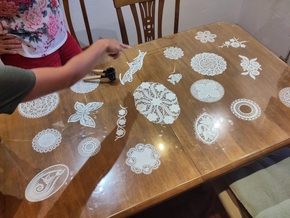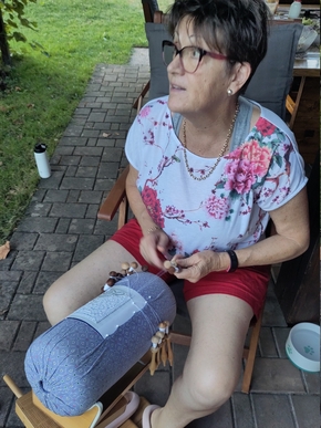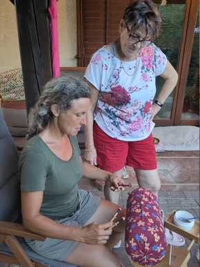 Nous prenons tout notre temps car aujourd’hui est l’anniversaire de mariage de nos hôtes. Nous ramassons un beau caillou et y inscrivons un message en leur honneur. La descente va plus vite que la montée et nous arrivons pile poil pour passer une bonne soirée avec eux. Nous en profitons pour suivre un master class de Jana sur la broderie. Elle l’enseigne dans le coin. Elle fait des choses admirables avec quelques bobines et du fil. C’est sa méditation, nous dit-elle. Nous nous y essayons brièvement. Elle nous ouvre son atelier et partage sa passion pour le patrimoine slovène avec beaucoup de cœur.