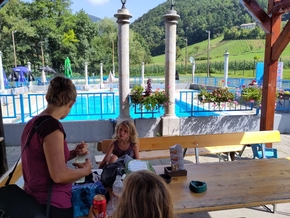 Nous pouvons manger tranquillement notre repas et nous baigner. Nous discutons longuement avec Urban, le serveur, qui est également un voyageur et un musicien. Nous nous sentons bien ici et les enfants profitent à fond de la piscine.